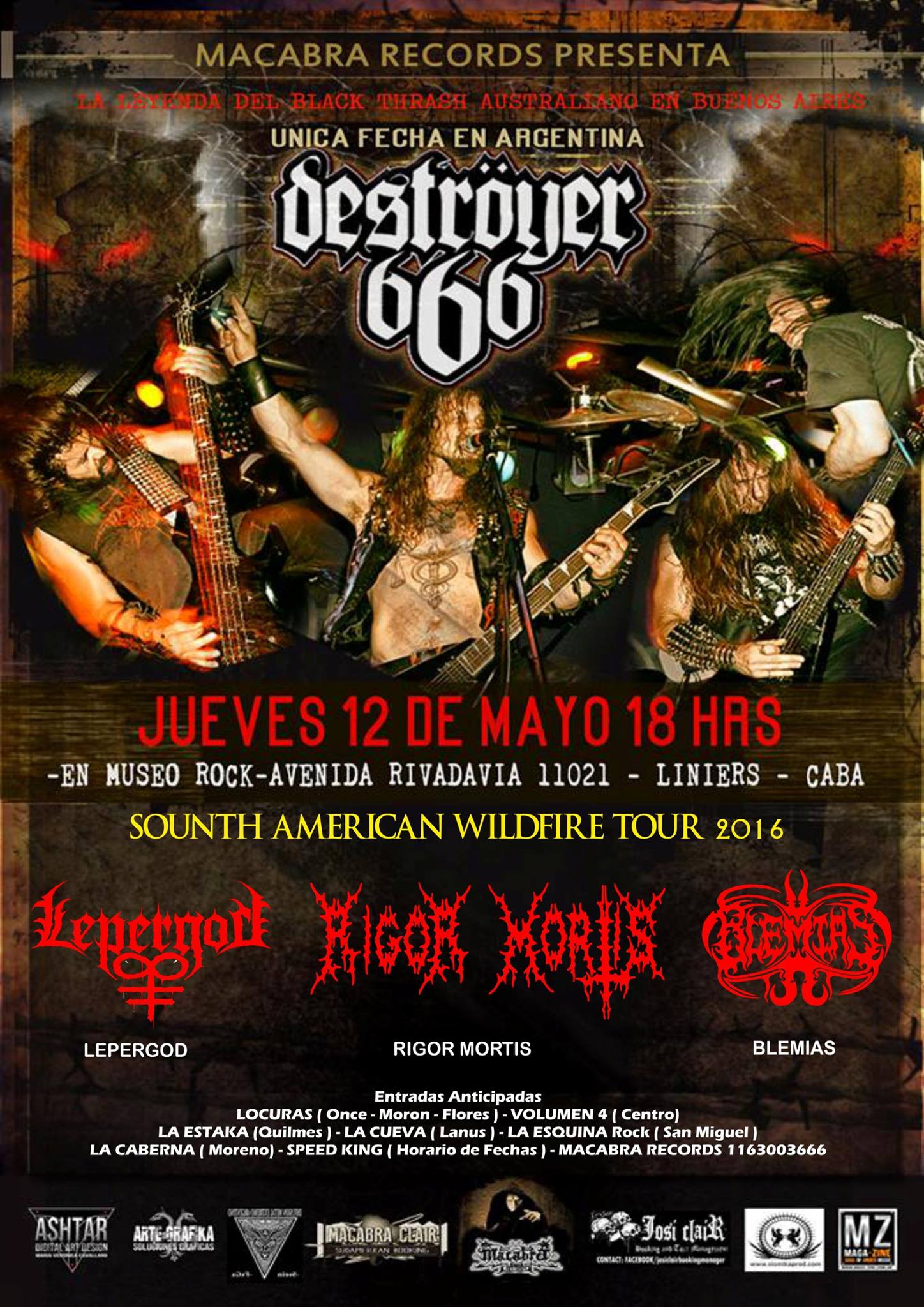 De la mano de Macabra Records Producciones, en el los últimos doce meses hemos tenido el privilegio de recibir en nuestro país a varias bandas extremas de culto que muchos hubieran pensado imposible. Fue el caso de bandas como Prostitute Disfigurement, Asphyx, Aura Noir o Cancer. En esta ocasión fue el turno de Deströyer 666, banda originaria de Australia (actualmente radicados en Londres) que debutaron en nuestro país luego de haber llegado hasta Brasil en 2009. Como es habitual, el recinto elegido fue Mvseo rock, que siempre cuenta con un gran sonido. La elección de las bandas nacionales demostró una vez más el gran nivel de la escena vernácula, sin nada que envidiar a las bandas extranjeras.