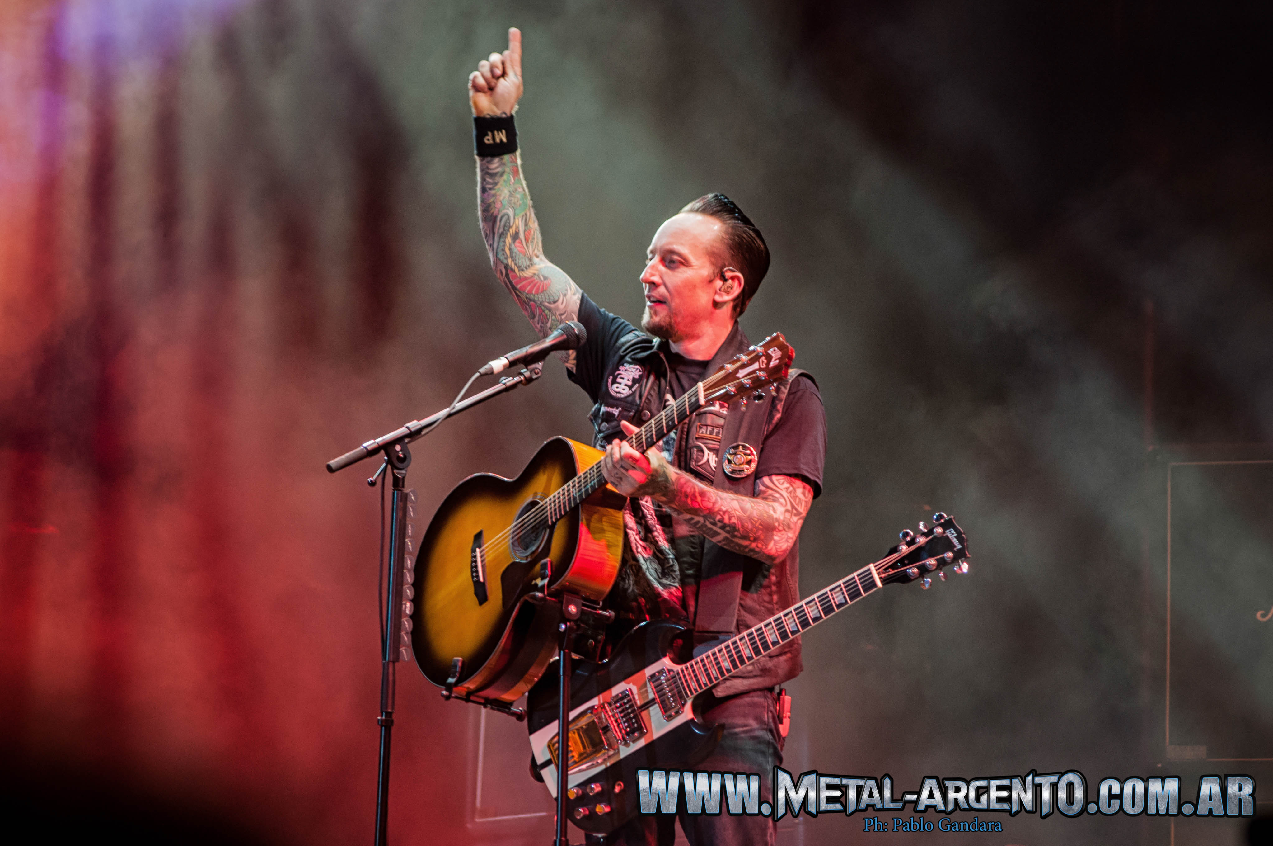 Con luces apagadas comenzó la intro, con nada más y nada menos que «Born to Raise Hell» de Motorhead (que buen tema para entrar al escenario) y así fue que entró VOLBEAT a escena tocando «The Devil’s Bleeding Crown». Los daneses liderados por Michael Poulsen en voz, totalmente fresco y con el carisma que lo acompaña, interpretaron unas 16 o 17 canciones. Presenciados por una gran cantidad de público que canto y salto la mayoría de sus canciones. Terminan de completar la banda, el ex Anthrax, Rob Caggiano, Jon Larsen en batería y Kaspar Boye Larsen en Bajo, para ir cerrando su set interpretaron «Maybellene I Hofteholder» y «The Mirror and the Ripper».