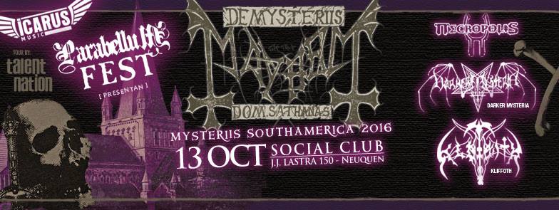 Llegó el turno de la otra banda de Córdoba; Darker Mysteria, una banda que hace un Occult Black Metal de alto nivel técnico y musical, la cual nació como proyecto solista llevando el nombre homónimo de su fundador; el músico multi-instrumentista Darker Mysteria. La banda empezó a pisar los escenarios metaleros en el año 2013, llevando una música demoledora y oscura. Sus músicos son, Darker Mysteria: Voces y Guitarra líder – Dr Death: guitarra y coros – Noctem Aeternus: Bateria – Svart Sjel: Bajo. Ésta banda es la primera vez que pisa suelo neuquino, y demostraron que el black metal en suelos argento está más vivo que nunca y goza de una muy buena ¨salud¨ y en temas como «Liturgia de Oscuras Místicas» y «Bajo un Aspecto Lunar Siniestro» demostraron ser una banda de la ostia.
