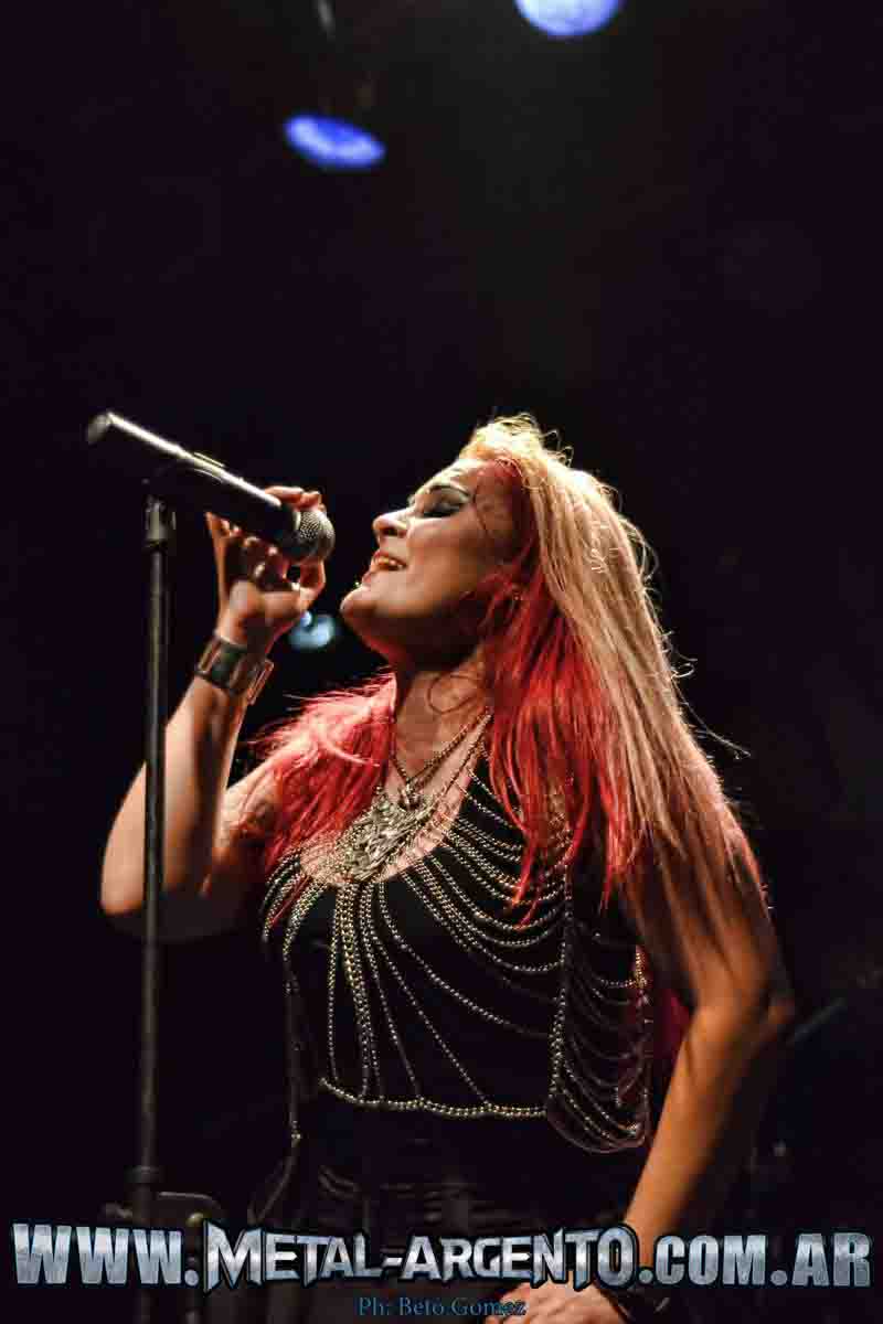 Cuando tras una breve espera, la iluminación, excelente por cierto, volvió a cobrar vida con la presencia de la banda alemana Xandria. Acudieron prontamente al llamado a viva voz del publico, abrieron con uno de sus hits mas conocidos, el tema “Nightfall” haciendo explotar a la concurrencia. Demostrando de arranque nomas quienes son, donde están y a donde quieren llegar, con un excelentísimo despliegue escénico y técnico, de la mano de su brillante voz la Soprano Dianne van Giersbergen. Quien demostró su amplio espectro vocal y su talento, a pesar de estar hace relativamente poco tiempo en la banda.