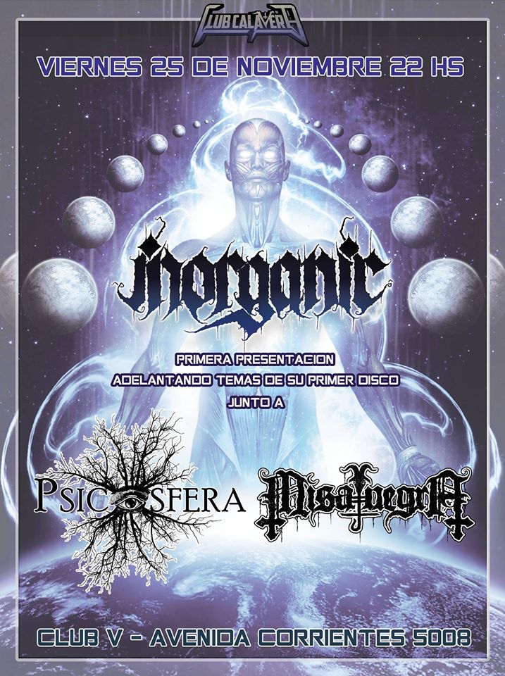 Inorganic es un proyecto de black/death formado por músicos de importantes bandas de la escena extrema como Necroabortion y Wolves Winter, cuyos orígenes se pueden trazar hasta el año 2014. El conjunto se consolidó al año siguiente con el ingreso de Hernán Alzamora, vocalista de Zoofilia. Su show debut fue el pasado 25 de Noviembre en Club V, en el espacio del Club Calavera que se realiza cada viernes. Para la ocasión estuvieron acompañados de otros conjuntos que también cuentan con la particularidad de sumar entre sus filas a integrantes de diversas bandas y arrancan con la vara bien alta.