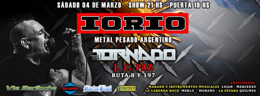 Ricardo Iorio, uno de los máximos exponentes del Metal Pesado Argentino, se presento nuevamente con su proyecto de solista «Iorio», sonando majestuosamente en el complejo Tornado de José C. Paz. Lugar que fue testigo del repaso de su extensa carrera musical, para deleite de todos sus fieles fanáticos.