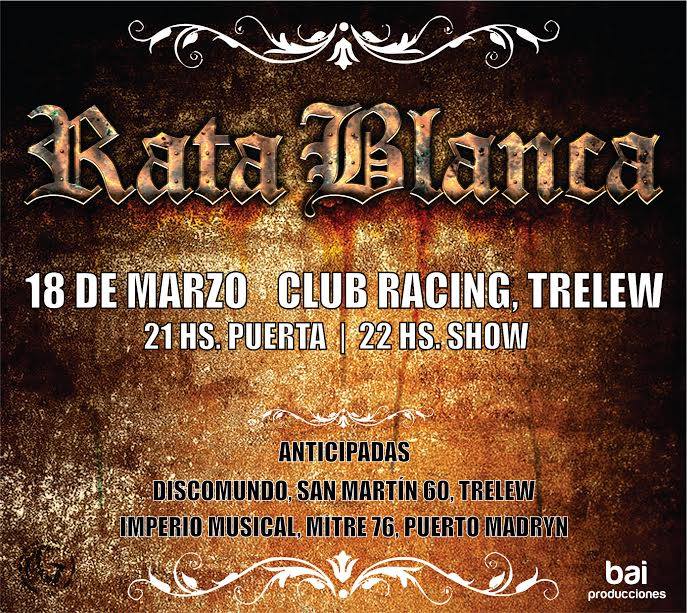 Siete años tuvieron que pasar para que Rata Blanca pisara nuevamente suelo sureño, y más precisamente en la ciudad de Trelew. La cita del evento se daría el 18 de marzo en el Club Racing, ubicado en la calle 25 de mayo 925. Quien los convocó fue la productora ‘Bai Producciones’, reconocida en la zona por hacer historias en cada uno de sus eventos, a cargo de Federico Pena Duarte.