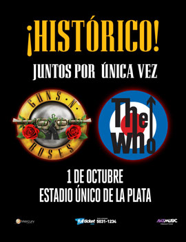 The Who dio su primer concierto en Argentina. Roger Daltrey y Pete Townshend formaron la banda en 1964 junto a John Entwistle y Keith Moon. Vendieron más de 100 millones de discos y es una de las bandas de rock más importante del siglo pasado. Guns N’ Roses nació en 1985 de la mano de Axl Rose e Izzi Stradlin, a la cual luego se sumarían Duff McKagan y Slash. Vendieron mas de 150 millones de discos en todo el mundo y se presentaron trece veces en el país. Cinco de ellas únicamente con Axl Rose como miembro original.