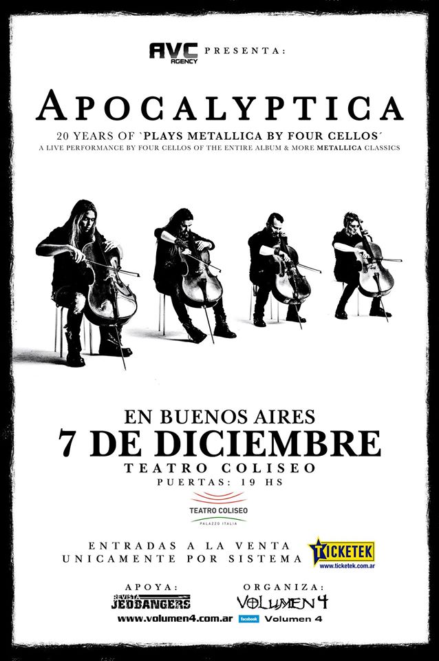 La noche del jueves 7 de Diciembre, pre finde semana largo, con un transito agobiante y un calor en la ciudad que no daba tregua. No pudo detener a los metaleros que se acercaron a la entradas del Teatro Coliseo, algo poco habitual, quienes casi colmaron el lugar para ver a Apocalyptica bajo su tour «Plays Metallica by four Cellos». Disco que lanzó a la fama a la banda allá por el año 1996, y como celebración de sus 20 años salieron de gira por todo el mundo, pero que sería de este disco sin un cuarto cello. Al principio, algunos fanáticos pensaron que pondrían a Mikko (Baterista) a tocar el cello, ya que años anteriores mostraron a través de su canal de you tube dandole clases de Cello. Pero no, para sorpresa de todos decidieron reincorporar a Antero Mannimen, miembro original de la banda.