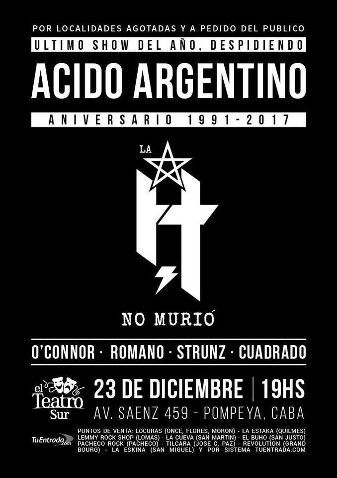 La banda hizo un repaso por casi todos los temas de Ácido Argentino, entre los cuales estaban, Memoria de Siglos, Predicción, Vientos de Poder, Gil Trabajador y Evitando el Ablande, canciones icónicas de la banda. La canción que algunos esperaban escuchar y no tocaron en ninguno de los shows de la gira aniversario fue el track 11 del disco, En las Calles de Liniers.