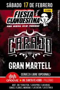 La Fiesta Clandestina ya es un clásico de la noche porteña. No importa el género, siempre el resultado es bueno. A veces las Fiestas son de cumbia, otras de raggae. En esta ocasión quien se adueño fue el rock pesado y el metal. Además de Carajo, Vaquero Negro y Gran Martell se hicieron presentes en el escenario de Groove. Desde México y con una fuerte impronta de Rage Against The Machine, Vaquero Negro conquisto a los que primeros que se acercaron al local de Palermo. Además se despacharon con una reversión en español del clásico de Beastie Boys «Sabotage». El comienzo fue alternativo y Carajo es una banda que esta por fuera del metal tradicional. Sin embargo, Gran Martell es una banda que retoma la impronta del rock de los años setenta. Y no es para menos si los integrantes son músicos fundacionales del rock argentino como Tito Fargo, guitarrista de Los Redondos, Hurlingham Regggae Band y eventual reemplazo de Germán Daffunchio en Sumo, Jorge Araujo, ex-baterista de Divididos, y Gustavo Jamardo, ex Porco en bajo. Mas de una vez agradecieron a Carajo por la invitación a la fecha y al público presente.