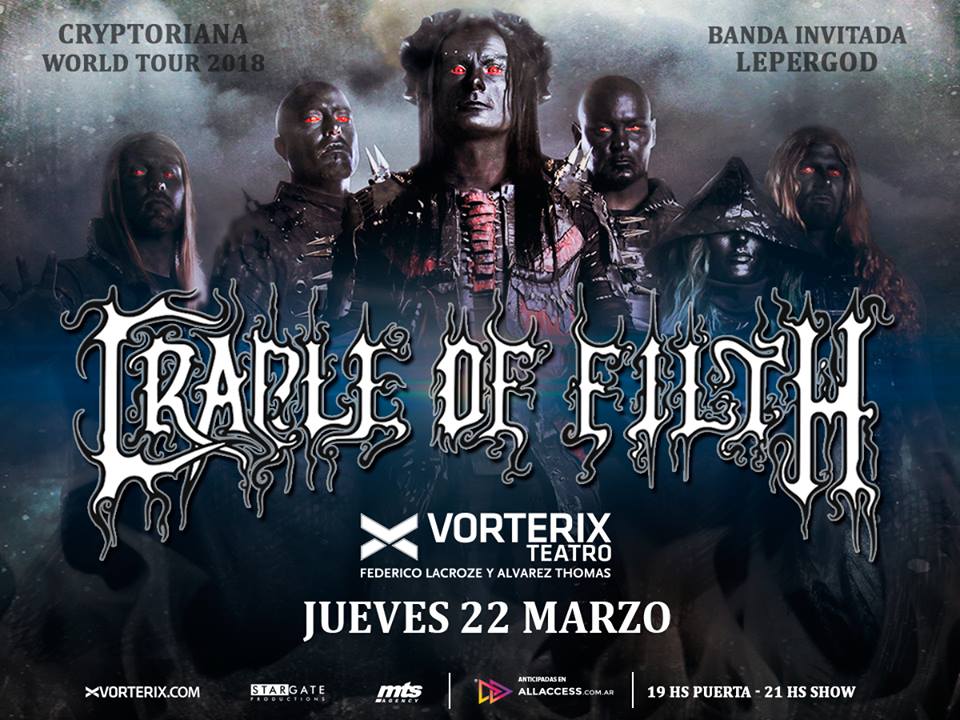 Cradle of Filth pisó el suelo argentino por tercera vez en su carrera. En esta ocasión, presentó el nuevo trabajo discográfico “Cryptoriana – The Seductiveness of Decay”, el doceavo para ser preciso. De antesala estuvo Lepergod calentó el escenario. Liderados por Rodrigo “Thav” Sánchez (Voz y Guitarra) pintó actitud firme con idas y venidas para con el público al termino de cada canción.