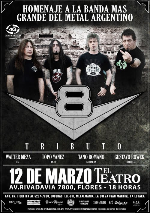 Siguiendo la ola de homenajes, la nueva cita era el sabado 12 de marzo para un tributo a V8, con la participación de Gustavo Rowek como cabeza de esta formación por ser el único ex v8 de este homenaje, lo acompañaron el Tano Romano, el Topo Yañez y en la voz Walter Meza, la propuesta era concisa, cuatro músicos interpretando temas de V8 uno atrás de otro, como nos dijo Rowek en la entrevista que nos concedió «no va a haber invitados, los 4 músicos, palo y a la bolsa.