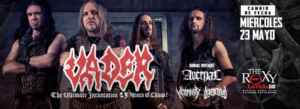 La banda polaca de death metal Vader conformada por Piotr «Peter» Wiwczarek (vocalista), Marek “Spyder” Pająk (Guitarrista), Tomasz «Reyash» Rejek (Bajo) y James Stewart (batería), no tocaba suelo argentino desde julio de 2012. En aquella ocasión se presentaron en esa ocasión en el Teatro Reducci, que actualmente ya no realiza conciertos, sino eventos teatrales. En esta oportunidad, Vader toco el miércoles pasado en The Roxy Bar haciendo parte de su gira mundial “World Incantation Tour 1993-2018 y teniendo tres soportes de gran calibre nacional como: “Avernal”, “Victimario” y “Descarnado”.