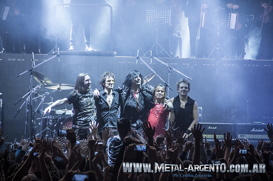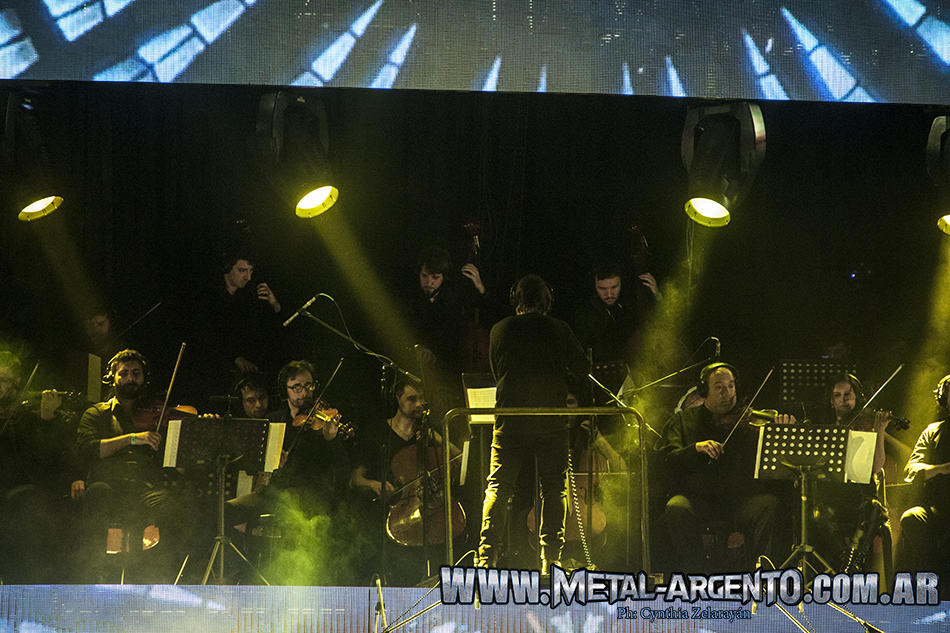 Siendo el final del show eléctrico con «Agord» era momento que la pantalla se levantará y saliera la Orquesta o eso entendimos nosotros que pasaría pero no, para la sacada de pelucas de todos esa pantalla se dividió en dos partes en el centro estaba toda la orquesta ya sentada. Dando el pie para otra hora y quince minutos mas de show, compuesta por ocho canciones «La llave de la puerta secreta», «El guardián de la luz», «Noches sin sueño», «Capricho árabe», «Sinfonía Fantastica», «El sueño de la gitana», «La leyenda del hada y el mago» y «El último ataque». Contarles como sonó la orquesta en «La hija del Océano», olvidenlo. Sino lo vivieron no saben lo que se perdieron; fue Rata Blanca potenciado como nunca en la vida se escucho, con los arreglos del Director de Orquesta Patricio Villarejo y con unos violines filosos y sagaces. Casi al final no se pudo escuchar la orquesta y la gente puteo al sonidista, pero son cosas que en un show de estas inmensidades es posible que ocurra. Gran parte del show se escucho perfecto y la Orquesta fue aclamada por la gente al final.
