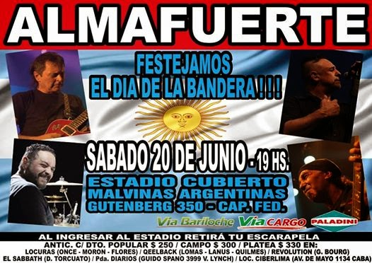 El 20 de Junio, en conmemoración al fallecimiento del general Manuel Belgrano se celebra el Día de la Bandera. Almafuerte siempre se caracterizó por congregar a su público con motivo de festejar estas fechas patrias y esta no fue la excepción. Anunciaron una nueva fecha en el Estadio Malvinas Argentinas, recinto al que regresaron después de la despedida de año del 2014. Otro dato de color del show era la salida a la venta en formato físico del nuevo álbum solista de Ricardo Iorio, Atesorando en los Cielos. En esta ocasión, la banda comandada por Ricardo Iorio y Claudio Marciello fue la única banda de la noche, sin bandas soportes. De esta forma la única previa al show fue la reproducción del Himno Nacional Argentino, el cuál fue cantado, coreado y hasta pogueado por los presentes que iban llenando el estadio, cuyas plateas estaban prolijamente adornadas con los colores de la bandera.