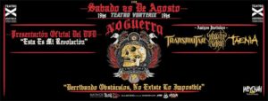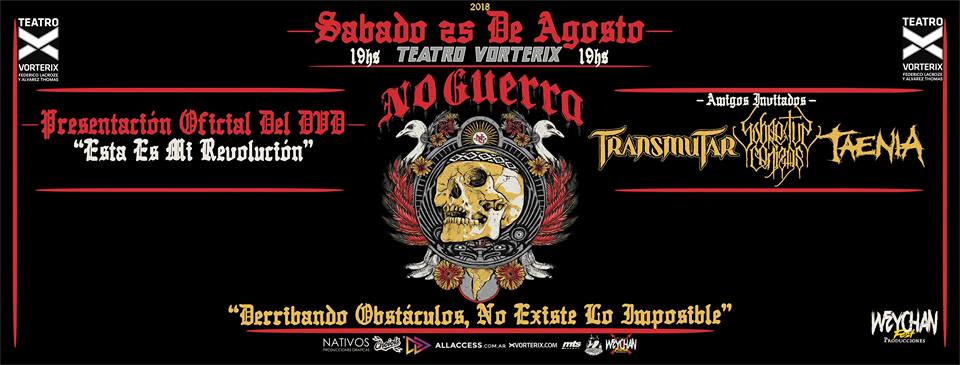 No Guerra es una banda comprometida y humilde. Hace tres años festejaron sus primeros diez años en un local mítico de la escena porteña: Salón Pueyrredon. Un local acogedor que reconforto a no más de 300 almas. Dos años después decidieron registrar en vivo un show y el local elegido fue The Roxy Live. Un año después la propuesta fue más que el doble: Teatro Vorterix. Allí invitaron a bandas amigas: Taenia, Transmutar y Sobre Tus Cenizas. Las tres bandas renuevan el amplio abanico del underground argentino. El Turco, cantante de Transmutar, organiza el ciclo Manija Cosmica en la zona sur de la provincia de Buenos Aires y que además durante la presentación colgó el pañuelo de la campaña por el aborto legal, seguro y gratuito que perdió la batalla dada en la cámara de Senadores pero que gano ampliamente en las calles del país.