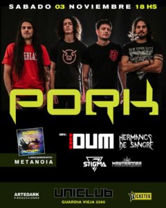 Cuando a mediados de año me entere que Pork planeaba su regreso no lo pude creer. En el mayor momento de despegue en una escena pesada tan complicada como la argentina hubo quiebres y la banda opto por separarse y dar fin a esa etapa. El cambio de bateros era una constante y luego fue el turno David Ortiz (bajo). Luego de varios shows en el conurbano y en Capital Federal, Pork volvió a un escenario mas que importante para su carrera: el de Uniclub. Allí presentaron oficialmente en sociedad MetanoiA, su cuarto disco de estudio.