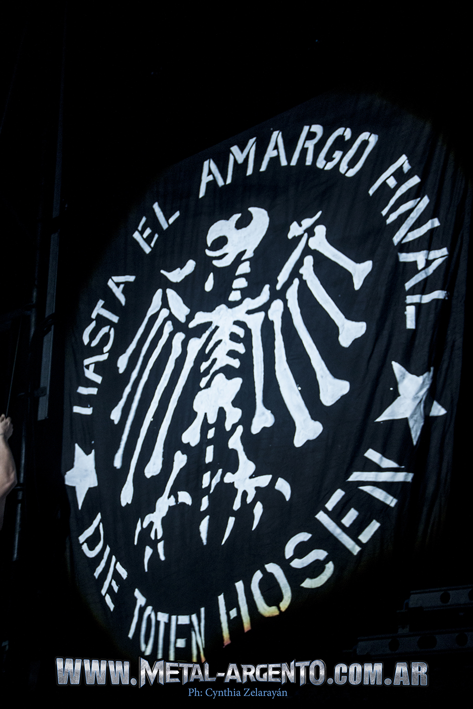 Die Toten Hosen salió al escenario a las 21.45 como estaba estipulado. Dos banderas negras, con el logo del banda en el centro rodeados por Die Toten Hosen y Hasta el amargo final, se izaron a los extremos del escenario. De fondo, una larga fila de amplificadores. Detrás, un telón gigante con la portada de Laune der Natur (2017) último disco de estudio que fue presentado el año pasado en el estadio Obras, además de Museum y Sala Opera de La Plata. El show duro dos horas y desfilaron 32 canciones. Tanto de su primer época – «Eisgekühlter Bommerlunder» – como de la nueva – «Auswärtsspiel» – incluidos covers – «Whole Wide World»,»Should I Stay or Should I Go», «Blitzkrieg Bop» y «Uno, Dos, Ultraviolento» -de Wreckless Eric, The Clash, Ramones y Los Violadores (con Pil como invitado). Incluyeron canciones como «Laune der Natur», «Bonnie & Clyde», «Altes Fieber», «Alles aus Liebe», «Hier kommt Alex», «Wie viele Jahre», «Schönen Gruß, auf Wiedersehen», «Tage wie diese» – con lluvia de papeles incluida – «Open-gang», entre otros. El marco del festival fue festejar la amistad entre los alemanes y los argentinos en estos 26 años. Pero justo también se festejo el aniversario de matrimonio de Kuddel. Para mas emoción Campino recordó a su padre – que le gustaba el vino tinto y la carne como a ellos – en «Das ist der Moment.»Ademas, le cumplieron el sueño a Denise, una fan brasilera, de cantar Paradies junto a ellos.