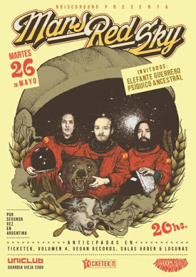 Los franceses Mars Red Sky, formados en la ciudad de Bordeaux en el año 2007, son una banda relativamente nueva en el mundo del stoner y la psicodelia. En ese lapso, apoyados en su excelente debut homónimo del 2011, el Ep Be my guide dos años más tarde y el flamante Stranded in Arcadia (2014), ya nos han visitado en dos ocasiones, una frecuencia pocas veces vista para una banda relativamente chica de este género. Su primera visita fue en el año 2013, y en esta ocasión repitieron de la mano de Noiseground en el Uniclub, pactando la cita para el día 26 de Mayo.