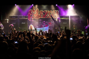 Pasadas las 21.00 hs. comienza a sonar de fondo “It’s a Long Way to the Top (if You wanna Rock and Roll)” y ya los corazones se comenzaron a acelerar. Se abre el telón, salen los cinco músicos a escena, y “Thunderbolt” – el tema que le da título a su última placa – es la seleccionada para iniciar una fiesta de casi dos horas de duración. Pegadita vino “Sacrifice” y acá los Sajones dejaron en claro que no le temen a su material más reciente. ¡Y lo bien que hacen! Porque una de las virtudes de Saxon es contar con una extensa discografía en donde no hay que ir demasiado atrás en el tiempo para poder encontrarnos con auténticas joyas de la más puro Heavy Metal. Pero los clásicos no se harían rogar mucho tiempo más y ahí nomás vino un tridente conformado por una seguidilla de canciones que mostraron el perfil más rockero de la banda, ubicándolos más cerca de AC/DC que de Judas Priest: “Wheels of Steel”, “Denim and Leather” y “Strong Arm of the Law”. A partir de aquí sería todo un intercambio casi constante en el set list entre su material más reciente y los clásicos de todas las épocas donde prácticamente no faltó ninguno. Entre las más nóveles sonaron la potente “Battering Ram”, la épica y pegadiza “Lionheart”, y ése sentido (y furioso) homenaje a los fallecidos de Motörhead titulado “They Played Rock And Roll”, también perteneciente a su último LP. Por el lado de los clásicos, “Frozen Rainbow” y “Broken Heroes” aportaron la cuota de reposo en el show pero la locura se desataría nuevamente con ése riff inconfundible que tiene “Power and The Glory” (por no mencionar el estribillo) o con la “acceptosa” “Solid Ball of Rock”; y por no hablar del pogo que se armó con “Motorcycle Man”. Quienes lamentaron la ausencia de otros clásicos como “NeverSurrender” o “The Eagle has Landed” (las cuales vienen siendo intercaladas dentro de la presente gira con otras canciones) podemos afirmar sin temor alguno que se habránvisto compensados por otras gemas como “Backs to theWall”, “747” (todo el mundo a cantar) o “And The BandsPlayed On”. La poderosísima “To Hell And Back Again” (confieso dejar casi el alma en cada estrofa), “Dallas 1 PM” y la infaltable “Crusader” fueron las encargadas de llevarnosal final del show.