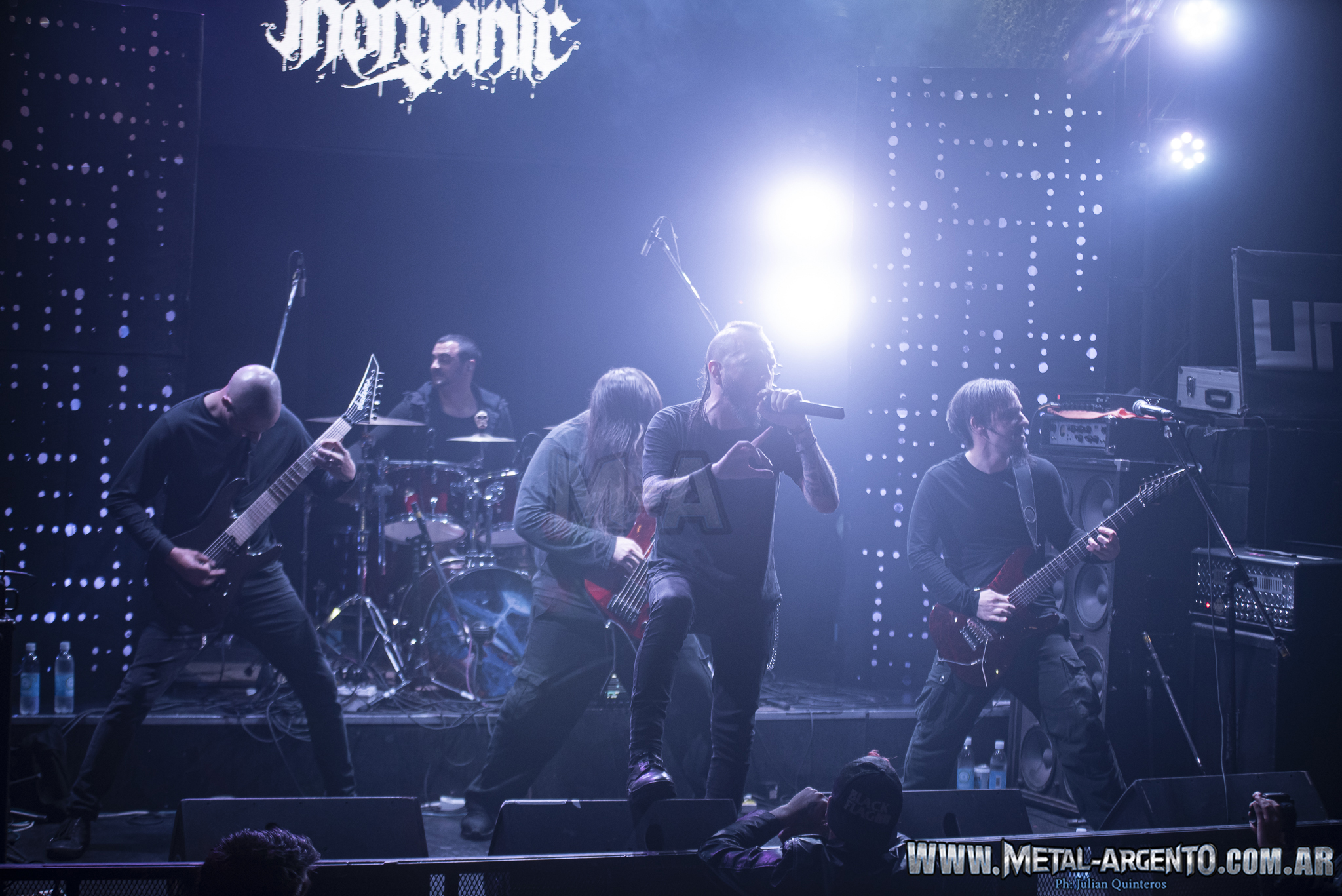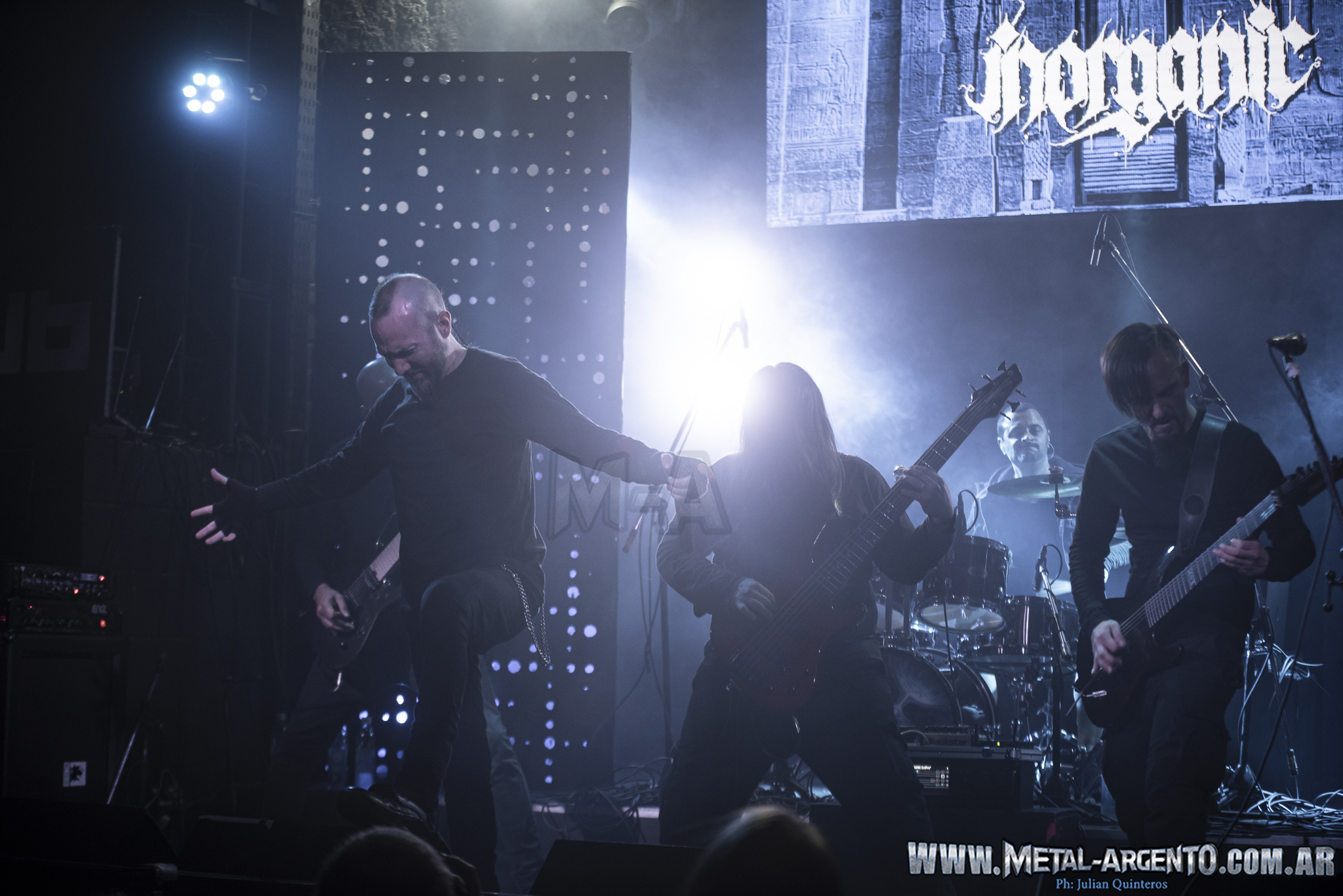 La banda en primer instancia apunta a lengua anglosajona. En segundo lugar, el sonido es brutal pero también juega con las armonías. En el escenario, Alzamora jugo con una cráneo creando un teatralidad. Lo interesante de Inorganic es que también apuesta a la descarga de sus canciones con código QR. Es decir, si bien la banda tiene una sonido clásico de la vieja escuela del metal extremo y salen a escena con ropa negra sin ningún tipo insignia con tintes teatrales suman también nuevas tendencias, porque entienden que el mundo esta sujeto a cambio.
