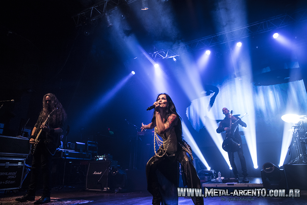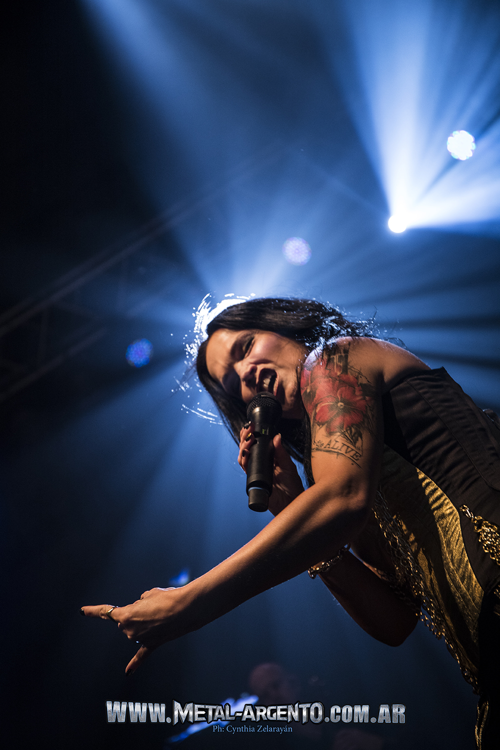 A las 21 hs se abrió el telón dando el paso a los músicos, que luego darían pie para el ingreso a la dama del metal a puros saltos y sonrisas. Iniciando con «Serene», «Demons in you» y «My little phoenix» tras un breve saludo y una tarja de pocas palabras se la notaba disfrutar el show, desplazándose por todo el escenario con un corset dorado y pantalones negro de cuero siguiendo el la gama de colores de su tapa de disco y mucha elegancia como siempre.