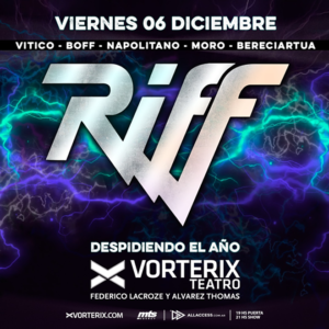 Riff realizó un último show en Capital Federal el viernes pasado. Mas precisamente en el Teatro Vorterix. Actualmente integrada por Vitico en el bajo y voz, Luciano Napolitano, Boff y Nicolás Bereciartua en las guitarras y Juanito Moro en la batería, brindaron el concierto con la totalidad del espacio ocupado del establecimiento. Ya no entraba ninguna persona más.