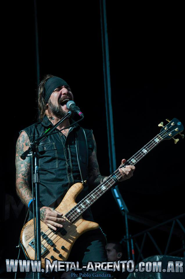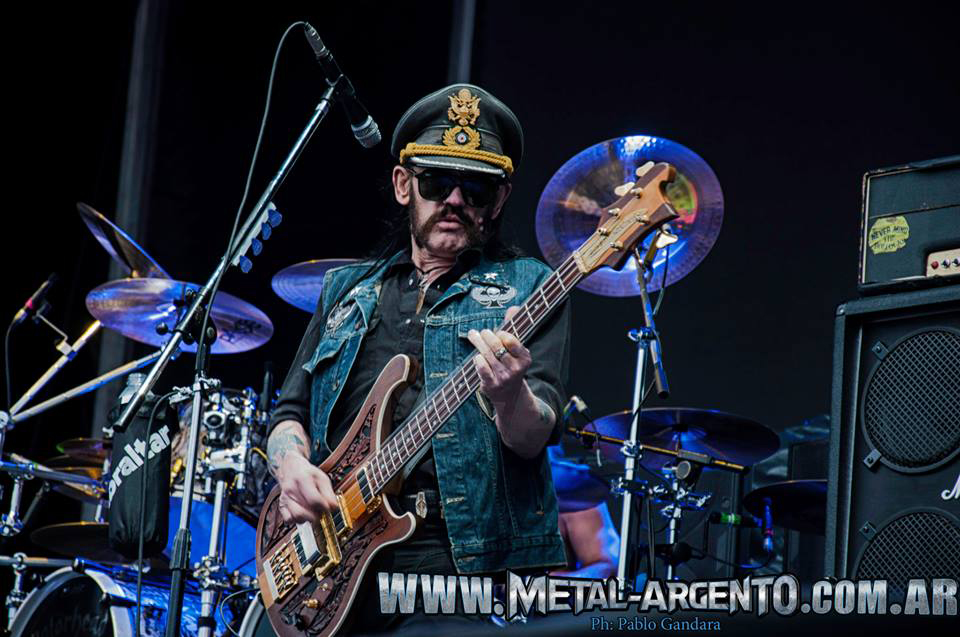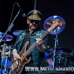 Una hora y diez minutos después, es decir a las 17:20 hs, se hicieron presentes Phil Campbell, Mikkey Dee y Dios… también apodado Lemmy Kilmister, acompañado de su inconfundible Rickenbastard, alimentado por su impresionante Marsha(ll) Vroom. Motörhead se presentó una vez más en Argentina en el marco de su 40° aniversario de existencia, dando inicio a su set con «Shoot You In The Back». Contando el tema en cuestión, los del enorme Lemmy performaron la friolera de catorce temas, siendo cuatro del disco «Overkill»; tres de «Ace Of Spades»; dos de «Aftershock»; uno de «1916»; otro de «Another Perfect Day»; otro de «Bomber»; otro de «Orgasmatron» y otro de «Rock ‘n’ Roll». Hubo un momento para el solo de Phil Campbell, precisamente al término de «Over The Top», y otro para el solo del gran Mikkey Dee en «Doctor Rock». El sonido en general no fue el mejor. De hecho, me dio la impresión (y no fui el único) que los locales Carajo sonaron mejor. Incluso a lo largo y ancho del show de Motörhead, se filtró por la guitarra de Campbell la transmisión radial de un partido de fútbol local, cosa que no solo sorprendió al público presente sino además a los mismísimos músicos. Qué decir de Lemmy. Es imponente. Es Dios, está claro. Y lógicamente, portando sesenta y nueve años de edad, no está como hace dos décadas atrás. De hecho, debido a un fuerte malestar estomacal, no pudo presentarse en la edición paulista del festival el pasado sábado 25 de abril. Mucho se temía que se cancele su presentación para el resto de la gira sudamericana. Pero no. Con sus sesenta y nueve pirulos, dio el presente y todo de sí.