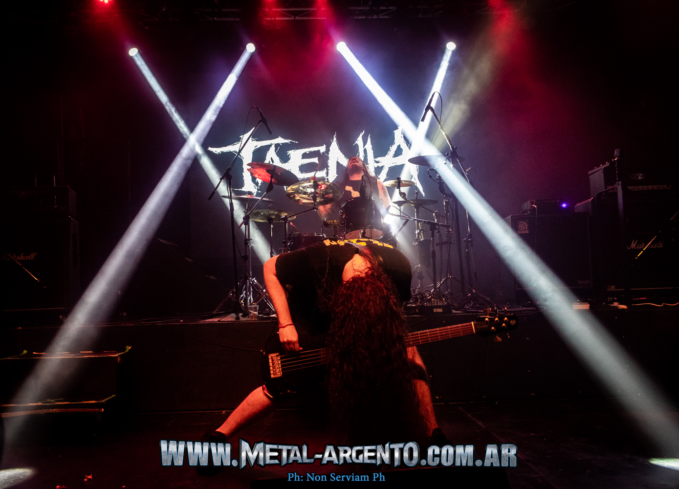 Llegadas las 21:30, toma posesión del escenario Taenia arrancando con “YYZ”, seguido de “Mudo” e “Ictericia”. Si hablamos de una banda que realmente se impone sobre las tablas, podemos decir que estamos hablando de Taenia. Una calidad excepcional en cada nota ejecutada, acompañado incluso de un excelente manejo de las luces para generar el ambiente que ellos quieren. Los dos temas siguientes, presentados como una historia (la cual se puede disfrutar con los vídeos), fueron “Parotiditis” y “Región Anal”. Luego con “Reservoritis”, “Irreversible” y “Prolapso”, nos siguen reventando la cabeza y llenando de energía para agitar aún más.
