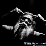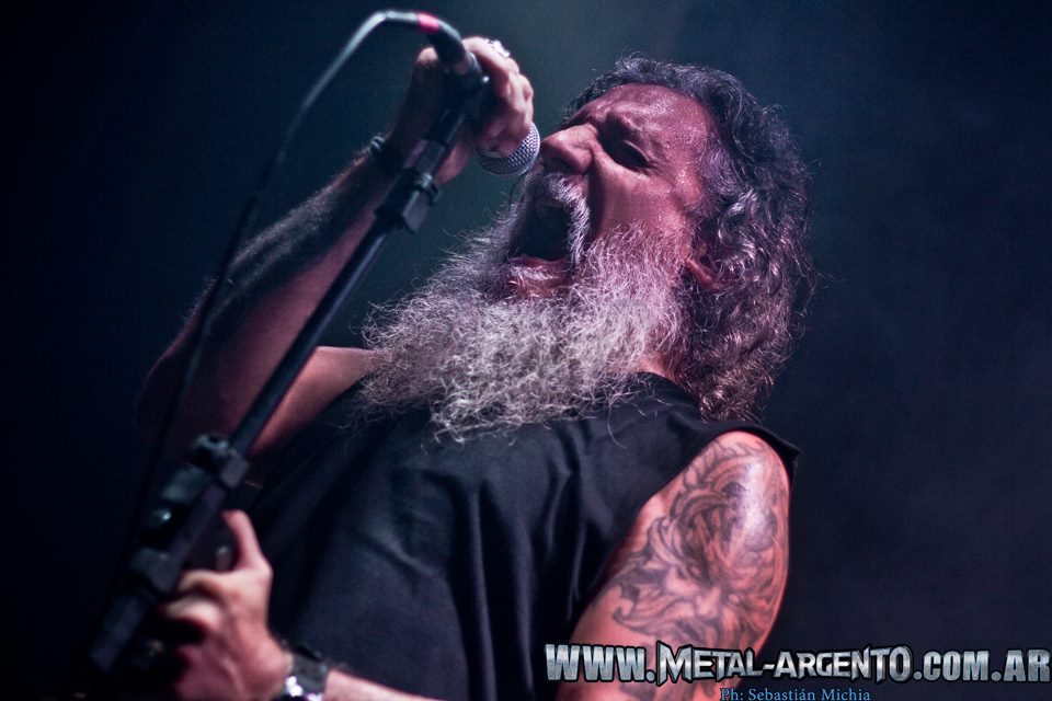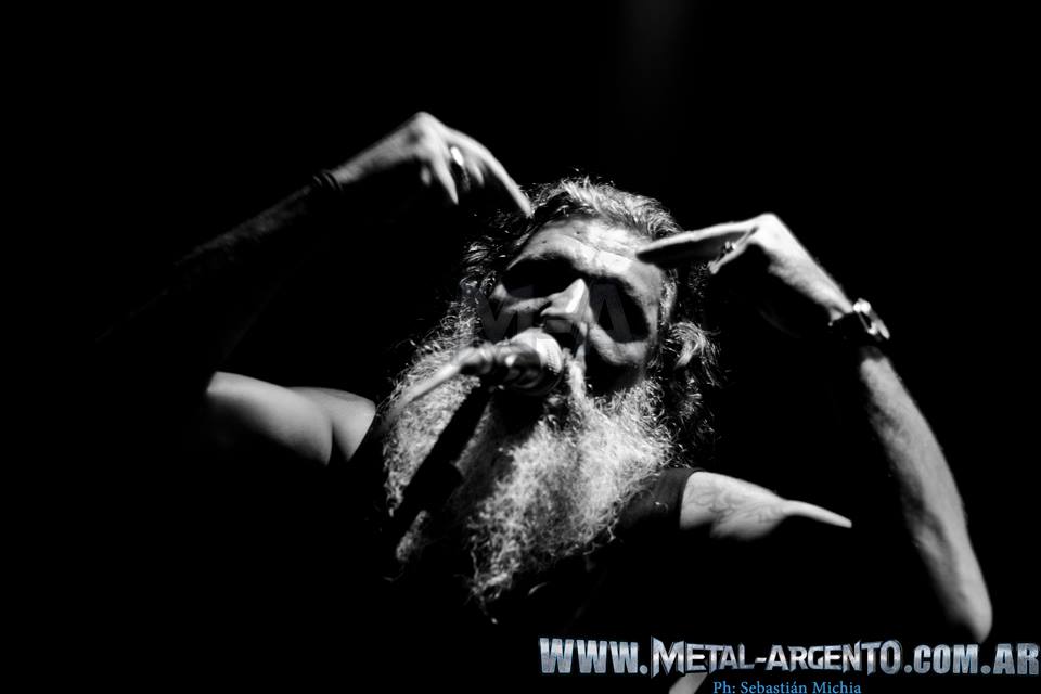 Luego de fumar en las montañas con la infaltable “Niño Lobo”, nos entregaron una versión extendida de “Pastor de Glew” dados algunos inconvenientes con el equipo de bajo. “Cruces”, del primer disco, es otro tema de los que no debe faltar nunca. Con un riff ultra doom, lento e intenso, un estribillo donde el Pato descose sus cuerdas vocales y un interludio al borde de las lágrimas, se convierte en un momento cumbre de la noche. Continuando con sus composiciones de antaño, el público explotó con “Paisaje final” (de Sobrenatural, 2003), “El círculo” (de Sauron, 1997) y “El color que cayó del cielo”, del segundo álbum que lleva dicho nombre editado en 1999. Volviendo a su material más reciente, sonó “Por costumbre” (de El último árbol sobre la tierra, 2012) y la clásica “Conjuro” (de La guerra del fuego, 2009) tras la cual el barbudo vocalista se arrojó a la marea del público.