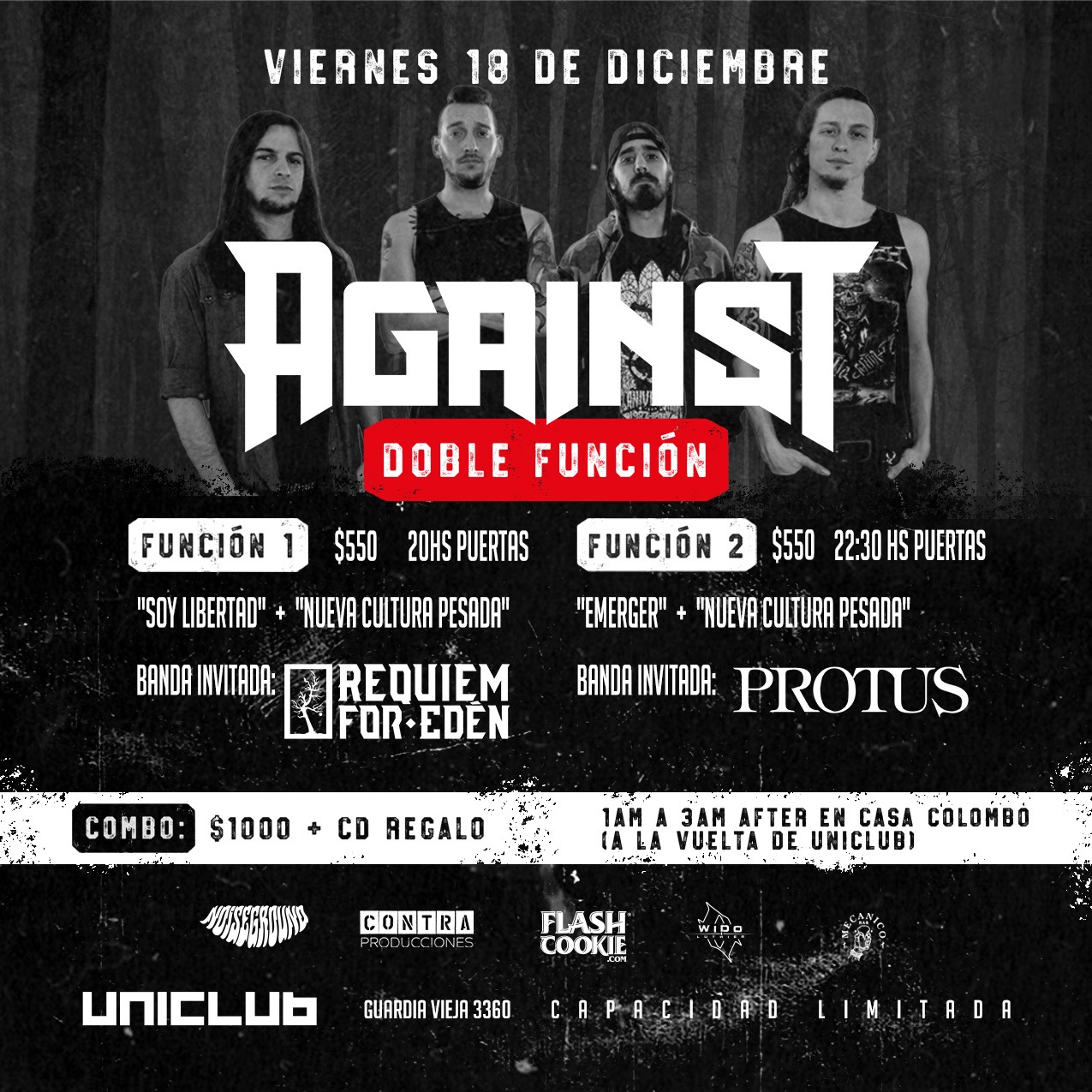 Los shows serán completamente diferentes, en la primer función Against estará tocando su disco ¨Soy Libertad¨ y parte de ¨ Nueva Cultura Pesada¨ y contará como banda invitada con Requiem for Eden, mientras que en la segunda el público tendrá la oportunidad de escuchar completo el disco titulado ¨ Emerger¨ y parte de ¨Nueva Cultura pesada¨, en esta función ¨Protus¨ será la banda encargada de abrir la velada.