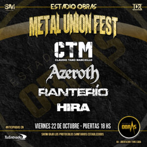 El festival Metal Union Fest llega por primera vez al estadio Obras. Este evento que reúne bandas de varias generaciones y estilos de metal tendrá su celebración más grande el 22 de octubre a partir de las 22 horas. En esta ocasión, será de la partida CTM (Claudio Tano Marciello), Azeroth, Ranterío y Hira.