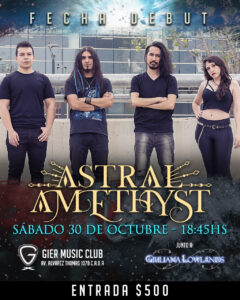 La joven banda argentina de metal sinfónico Astral Amethyst anuncia su primera fecha en vivo el próximo sábado 30 de octubre. El debut esta programado para que sea en Gier Music Club (Av. Álvarez Thomas 1078) junto a Giuliana Lowlands.