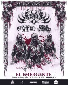 Cadáver Putrefacto, fue la encargada de abrir la noche del sábado. La banda se formó en el 2000 pero volvió a la actividad en el 2015. Tras varios cambios en la formación, en la segunda mitad del 2020 lanzan su segundo disco Ritual de exanguinación el disco cuenta con 10 tracks de los cuales 6 fueron parte del setlist de su presentación, tales como “Sanguinaria represalia”, “Necrofobia” y “Suprema castración”. Ante un emergente bastante concurrido Cadáver Putrefacto, desarrolló una muy buena performance que fue grabada para un futuro disco en vivo.
