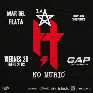 Luego de sus dos funciones en Estadio Obras Sanitarias con localidades agotadas y extensa gira que los está llevando a recorrer el país, La H no murió regresa a Mar del Plata, la cita será el viernes 28 de enero – 21hs – Gap (Av. Constitución 5780). El 8 de diciembre para homenajear a su primer grupo, Hermética, cerro el año en Obras de la Capital Federal con un show demoledor. La banda conformada por Claudio O´Connor, Tano Romano, Karlos Cuadrado y Javier Rubio se ha convertido en el show más convocante del género luego de su comienzo en 2019.