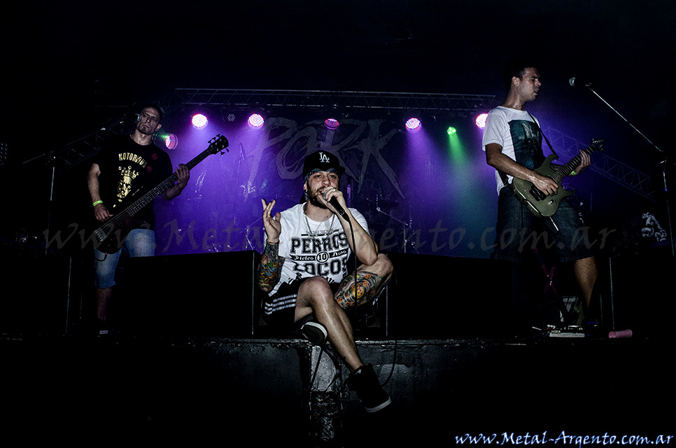 El show de Pork programado para las 21 horas fue puntual. Abriendo con «Friends don`t send their friends to rehab». De aplanador sonido la banda hizo un desfile por sus tres trabajos de estudios ya que temas como «The Wake» y «La Muerte del Angel» sonaron de manera tal que los pogos cada vez se hacían más intensos. Parejo en todo momento los pogos seguían al compás de «Mecanicidad», «Marcha hasta el final» y «Un mes sobre la tumba». Durante «30 años de Saturno» Juan de Perros Locos fue invitado a cantar junto a Czar. El sur unido en el escenario. Si bien todo estaba diez puntos había algo que llamaba la atención en el escenario; David Ortiz no estaba presente siendo ocupado su lugar por Augusto, manager de la banda. Justamente casi a medio recital Gastón aviso que David decidió dejar de ser parte de Pork por cuestiones personales.