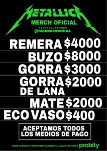 El merchandising oficial del recital de Metallica en Argentina 2022 en el Campo Argentino de Polo va a estar disponible solo en los puestos de venta dentro del recinto y se podrá adquirir con todos los medios de pago. Los valores van desde $400 a $8000.