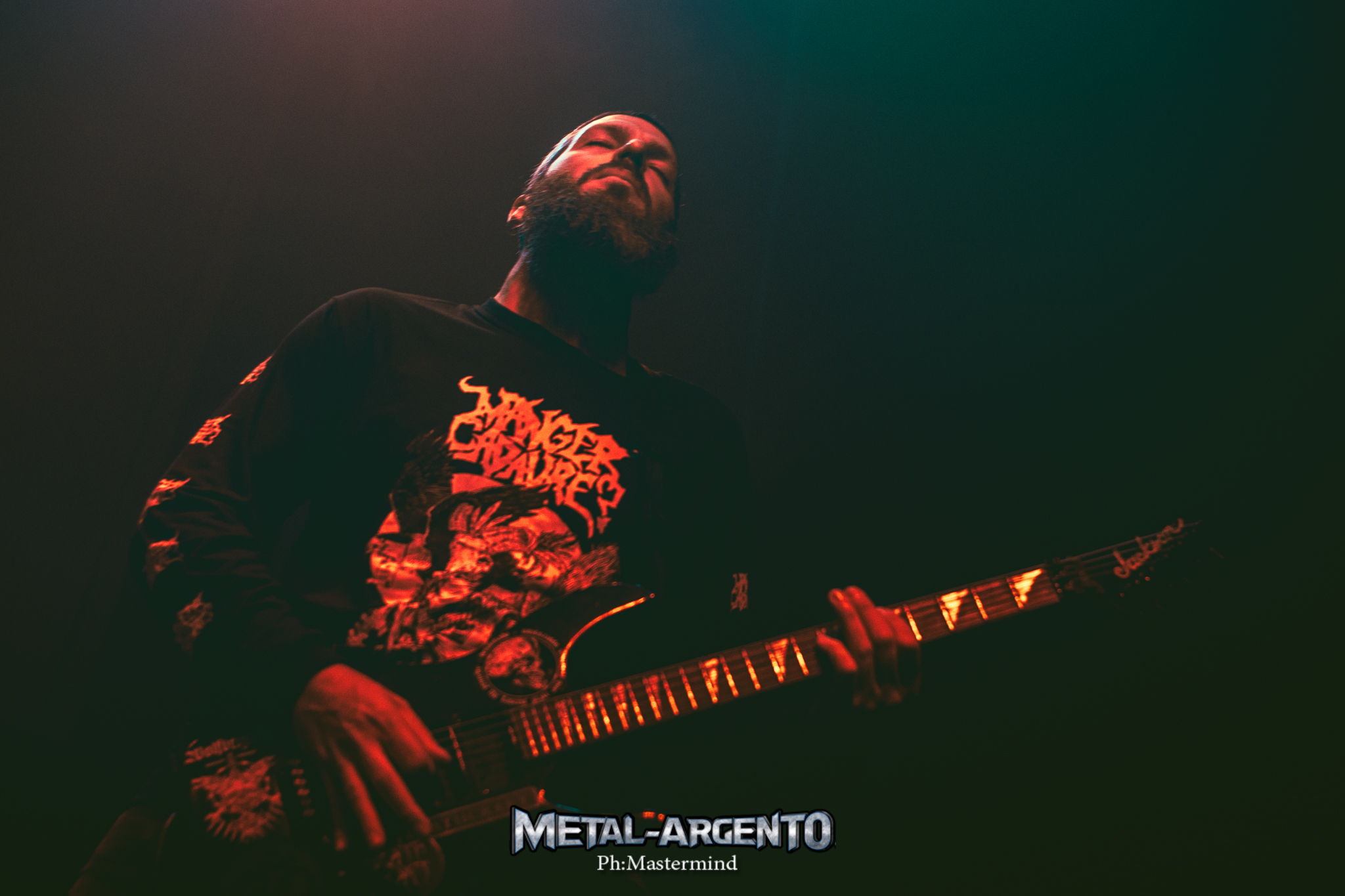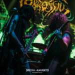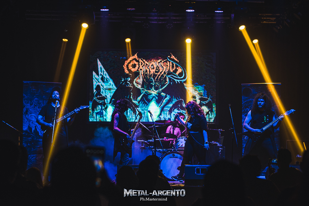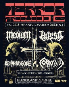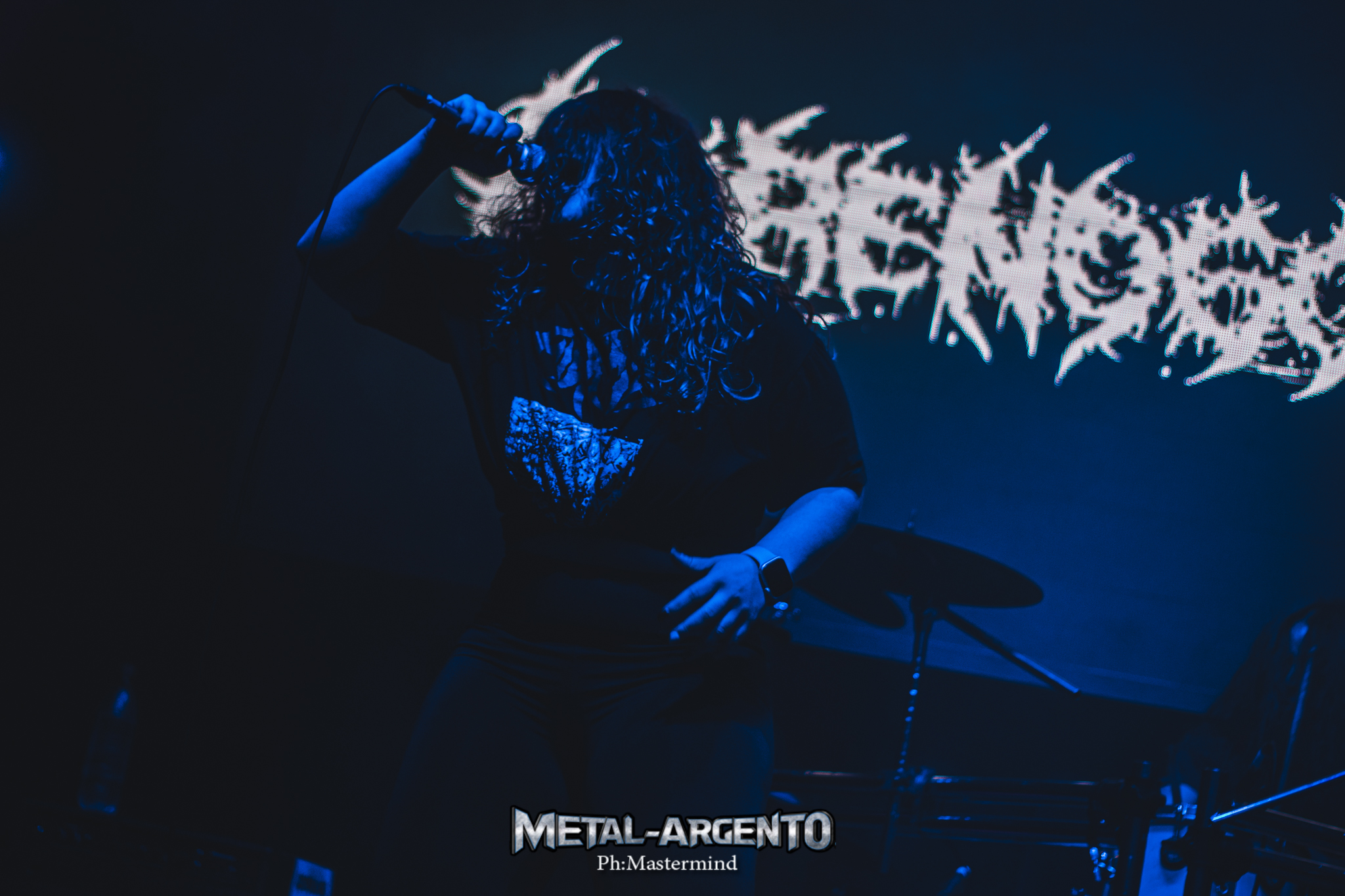 En esta oportunidad, cuatro bandas, como dije anteriormente, con voces guturales mostraron distintos sonidos actuales de la escena emergente. Corrossive como la primera en salir al escenario a las 19.30 horas viene de lanzar álbum debut The Great Beyond (2021) y propone un death metal con pericuetas thrasheras y progresivas. Y allí están dando velocidad palo y a la bolsa para quebrarse en grooves y machaques con tiempos intrincados. La adrenalina del tupa tupa se intensifica con la llegada de Adrenogore a las tablas. Si bien Angeles Justo (voz) había sido invitada en el set anterior, Emmanuel Di Giacomo también vuelve a colgarse el bajo para acompañar a esta joven banda que está a nada se editar material. Esta propuesta es un toque más visceral, una escuela más sucia y hasta con tintes tomando prestados del punk en cuanto a la rabia.