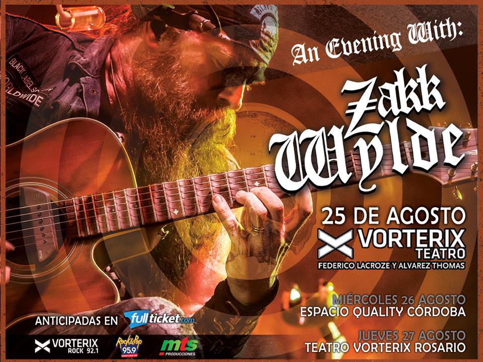 El martes 25 de Agosto tuvimos la oportunidad de tener nuevamente en nuestro país al legendario Zakk Wylde, anteriormente el años pasado había venido con Black Label Society, pero en está ocasión vino con un show acústico de su carrera solista, en especial de su disco «Book Of Shadows” a casi 20 años de su edición, de su etapa con el grupo Pride & Glory y canciones de su banda Black Label Society. Este show que no solo lo estaría presentando en el Teatro vorterix de Buenos Aires, sino también en Rosario y Córdoba.