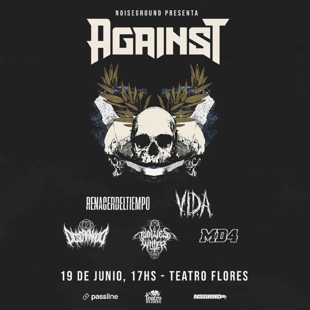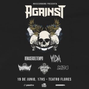Si hay una banda que vino a tomar la bandera del metal emergente, para llevarla lo más alto posible, sin dudas es Against. Siempre promoviendo la autogestión, la ayuda entre bandas, el no transar ni pagar para tocar, promoviendo bandas jóvenes o que hace rato vienen dando pelea en el under. El mote de banda exponente en esta nueva cultura pesada, le calza a la perfección. El año pasado llegaron al mítico Teatro Flores, en lo que fué hasta ese momento, su apuesta más grande. El resultado fue contundente, un teatro colmado por un público que dió la cara y demostró que el metal, en todas sus variantes, está firme y siempre presente. El siguiente paso fué confirmar que no se trató de un mero instante, sino que es una realidad consolidada, por lo que este año la banda apostó nuevamente al Teatro Flores. La cita fue el pasado lunes 19 de junio y las bandas en acompañarlos fueron MD4, Wolves’ Winter, Descarnado, V.I.D.A. y Renacer del Tiempo.