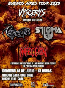 El domingo 18 de junio de 2023 en pleno festejo del Día del Padre, se llevó a cabo en “Rincón Casa Cultural “ cito en Rincón 1330 C.A.B.A una de las presentaciones de la banda de death metal Vyscerys de Santiago del Estero que realizó una gira de 4 días por Buenos Aires. Las bandas que acompañaron fueron Infección, Stigma, y Catacomb. Además, quiero mencionar que fue una tarde familiar porque hubo niños presenciando el show junto a sus padres que claramente ellos son el futuro y van a llevar la bandera del metal por todas partes.