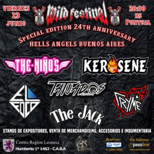 El viernes 23 de junio de 2023 se llevó a cabo los festejos por los 24 años de la agrupación Hell Angels, el lugar designado fue en el Centro Leonesa cito en Humberto 1° 1462 C.A.B.A. y las bandas anunciadas para esa noche fueron The Niño’s, Kerosene, Cryme, El Foco y The Jack Rock & Blues. Además también hubo una feria donde los expositores ofrecían, merchandising de diversas bandas artesanías,etc. La banda Tatuados no pudo ser participe de esta gran noche por inconvenientes en la movilidad de los músicos.