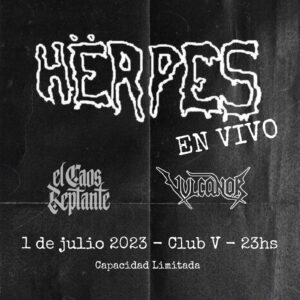 Hërpes subió al escenario ante un Club V sold out. El partido estaba ganado desde el vestuario. «El Blues del Inframundo», «Tumbas de Hormigon» y «La Iglesia Universal» fueron el tridente inicial que desató el delirio de los presentes, dejando la garganta en cada canción. En cuanto a la formación, julio vino cambios. Seba G en bajo y Medinus en batería tuvieron su bautismo aquella noche, mientras la dupla guitarrera conformada por Leander y Pablo Abal se mantiene inoxidable.