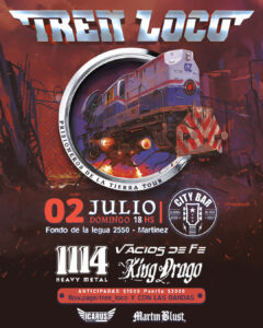 El City Bar es una parada obligatoria para la banda en lo que respecta a la zona norte de Buenos Aires y la presentación del nuevo material no iba a ser la excepción. Las bandas que acompañaron al Tren fueron Vacios de Fe, 1114 y King Drago. Con un buen número de asistentes, entré al recinto durante la presentación de 1114 y desde la puerta se podía escuchar el timbre vocal a lo Iorio. Es que la banda hizo un recorrido por la obra de bandas como V8, Hermética y Almafuerte, como así también algunos temas propios como «Agonizando». Luego fue el turno de King Drago, y su heavy rock, en la vena de Riff. La banda viene de lanzar su disco Amor Negro el año pasado, y algunos de sus temas fueron presentados, tales como «Octavo Día», «Luz y Oscuridad», «Destrucción» o «En la Ruta».