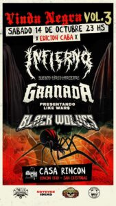 Infierno, la banda emblema de la nueva escena del hardcore nacional, la tercera edición de su ciclo «Viuda Negra», el sábado 14 de octubre a las 23 horas en «Casa Rincón», Rincón 1330, C.A.B.A. En esta oportunidad los también participarán del ciclo Granada y Black Wolves.