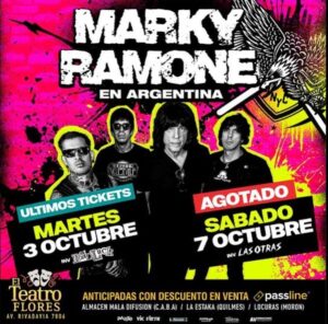 Marky Ramone se presenta nuevamente en Capital Federal el 3 y 7 de septiembre en el Teatro Flores – Av. Rivadavia 7806, para repasar los clásicos de la banda más importante del punk rock.El baterista ícono de la banda de New York brindará un concierto inolvidable, haciendo un repaso por los temas más clásicos del legendario grupo y en donde el eje central es homenajear en vivo el legado de Ramones. Durante 15 años fue baterista de una de las bandas mas significativas del punk rock mundial: The Ramones. Ingreso en en 1978 para reemplazar a Tommy Ramone. Debuto en el disco Road to ruin (1978) dejo la banda cinco años después y regreso en 1986 hasta el fin de la banda. Además, grabo algunas de las baterías del disco solista de Joey Ramone Don’t Worry About Me (2002). En su etapa solsita etapa comenzo vez finalizada la carrera de Ramones en 1996. Edito dos disco bajo el nombre Marky Ramone and The Intruders “Marky And The Intruders” y “The Answer To Your Problems?”; el segundo disco fue producido por Lars Frederiksen de Rancid y cuenta con la participación de Joan Jett.