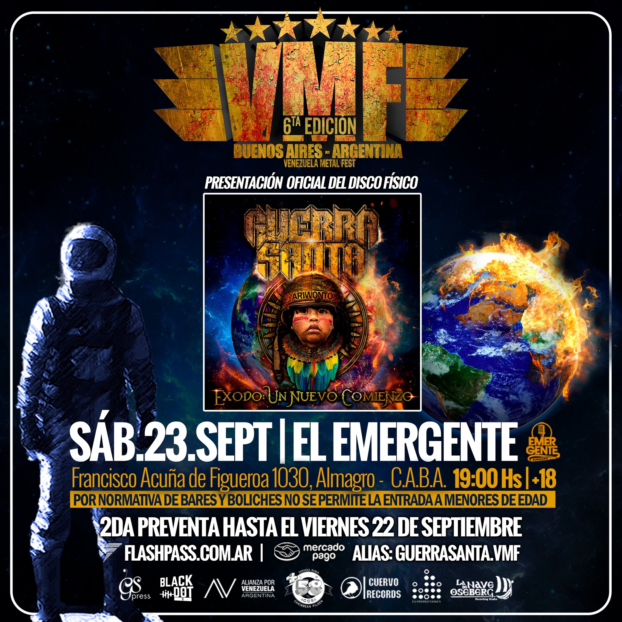 El pasado sábado 23 de septiembre se llevó a cabo una nueva edición del Venezuela Metal Fest en El Emergente Bar de Almagro. La sexta entrega de la una muestra de arte musical de artistas Venezolanos radicados en otros países de Latinoamérica fue compuesta por las siguientes bandas: Aftárkeias, Praise No One, Climatic Terra, Limitless y Guerra Santa.