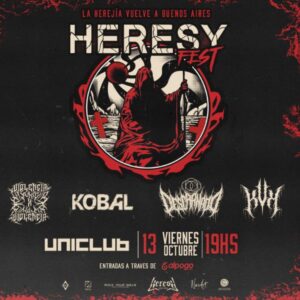 En cada una de sus ediciones – tanto presenciales como virtuales – los festivales organizados por Heresy Metal Media son una ejemplar muestra de las variadas y por demás interesantes propuestas que tiene la música pesada. Obviamente, la celebrada este año no fue la excepción. Como si le quisieran hacer un guiño a la película, la primera banda que subió el viernes 13 tocan con la cara cubierta. Sin revelar sus verdaderas identidades en ningún momento, KVM, este sexteto, desplegó una tormenta death core con doble bombo al taco. Guitarras disonantes. Bajo que te hace temblar la nuca. Y voz digna de las pesadillas más retorcidas. Si disfrutan de las vertientes más extremas del género, préstenles atención a estos muchachos. Los jinetes del Apocalipsis están por llegar.