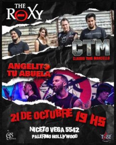 El pasado sábado 21 de octubre de 2023 se presentaron Angelito Tu Abuela y CTM conformando una dupla letal con el rock y el heavy como el gran atractivo en una noche previa a las elecciones nacionales. Esto sucedió en The Roxy, Niceto Vega 5542 C.A.B.A. Las puertas fueron abiertas a las 20:45 hs.Tarde noche con mucha gente en las calles de Palermo y más en los alrededores de The Roxy, donde se pudo ver muchísima gente con remeras de Angelito Tu Abuela que vinieron en un bondi repleto de fans, y también se vio mucha gente con remeras de CTM haciendo una gran previa de la fiesta que se iba a vivir próximamente.