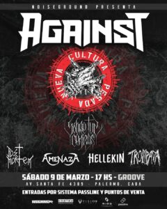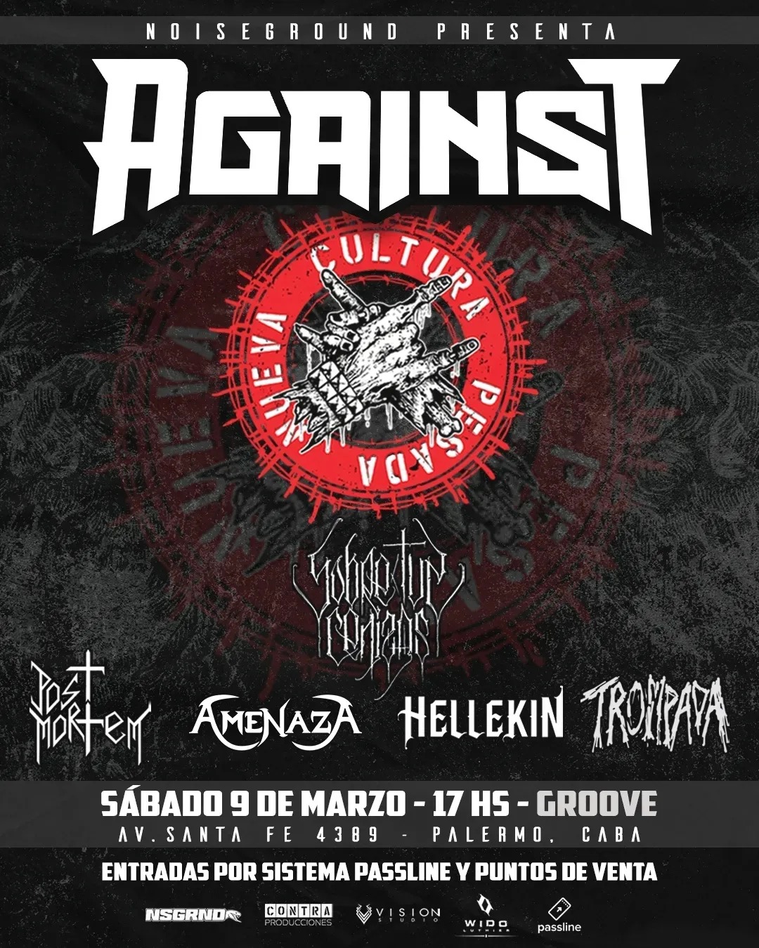 El pasado sábado 9 de marzo se llevó a cabo una nueva fiesta de la denominada «Nueva Cultura Pesada». Así reza el último trabajo discográfico de Against que vio la luz en el 2019, y más allá de no haber un motivo especifico para tal celebración, el mero hecho de reunir bandas de distintos estilos y emergentes, es más que suficiente para llevarla a cabo. Así es que Against convocó a Trompada, Post Mortem, Amenaza, Hellekin y Sobre tus Cenizas para llevar a cabo un encuentro metalero y emergente, en nada más y nada menos que Groove.