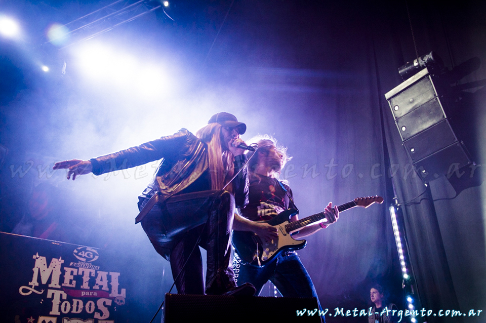 Circulo Activo. Dos horas de haber comenzado el evento el calor ya era agobiante, más de 30ºC y prácticamente ni una brisa. Aún así me fui a ver el show que Instinto Agresor que dio en el escenario número dos, lamentablemente se vio afectado por varios problemas de sonido, pero esto no impidió disfrutar y alentar un popurri de Black Sabbath. En el escenario Diego Conte se encontraba Violencia que desplegó su fuerza con «En Las Calles de Liniers». El primer momento para el disfrute de los más chicos fue de la mano de Play 3. Excelente nivel de los chicos que apenas están entrando en su pre adolescencia «Extraño», «Tal Vez» y «No Esperes» deslumbrantes. La tarde pasaba y las bandas no bajaban de nivel Pyscho Side con gruesas influencias de Metallica y Megadeth (si, de ambas) se asomaban en el escenario uno mientras que Mental bien heavy argento gritaba al sol debes resistir. La jornada continúo de la mano de La Condesa que contó con uno de los mejores sonidos del día. Tema a destacar «Ave de Paso». Mientras tanto afuera se encontraba Iridio y Vampaires. Después del Heavy Rock de La Condesa el escenario paso al mando Cautivo que trajo su arsenal de heavy metal con tintes thrash. Con mucho aguante poguero desfilaron tema como «Malditos» y «No Me Dejes Vencer». En el escenario número dos se encontraba Deny, una de las bandas que tuvo mayor crecimiento dentro de la nueva camada del metalcore/posthardcore. Si bien obtuvieron el respeto de los metaleros pesados, vieja escuela, no lograron un fuerte impacto siendo algo un escaso cumplidor show. Nuevamente dentro del estadio Kaustos manifestaba su enfermo Thrash/Groove metal. Los primero agites se vieron acompañado de «Disciple» de Slayer pero siguieron de la mano de «Cansado de Aprender» y «Dueño del Caos». Continuando el recorrido del escenario llegue a la presentación de Del Oeste que perfilen un sonido thrash nueva escuela muy cercano al actual Horcas, escuchar «Sobrevivo» por ejemplo. Dentro ya comenzado el set, me encuentre con Larry Zabala presentando temas de su último disco Pan y Circo que tuvo como invitados a Las Marionetas Viajeras y al gran Pablo Erzen de Milita (sería grato de ver a Milita en un próximo Metal Para Todos). El thrash no iba a dejar el escenario principal ya que Reinara La Tempestad, al mando de Hugo Benitez, revivió temas de su época en Horcas como «Violados y Devorados» y «Cosas Enfermas» aunque con algunos problemas técnicos. Bastante variado lo que se vivió afuera, por un lado Beto Vazques infinity que para mí tendría que haber estado en el escenario principal y así poder tener una mejor acústica por el estilo de banda que es. Algunos problemas de sonido y poco brillo. Aun así se pudo disfrutar de temas como «Existence» y «Time of Reflection». Por otro lado en el escenario Diego Conte Aerea dio un contundente show de nu metal alternativo que por momentos se encontraba cosas de Carajo. Renacer y Dhak en sus respectivos escenarios dieron lo mejor de sí contando con la participación de un efusivo público. Por otro lado Kiss My Ass animó la noche de algunos presentando algunos de los clásicos de la consagrada banda de Nueva York como «Lick It Up» o «Love Gun».