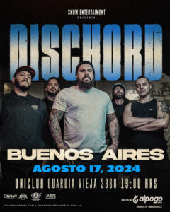 A siete años de su primera visita a nuestro país, Dischord vuelve a Buenos Aires para celebrar sus 20 años de carrera en el marco de una gira sudamericana que también pasará por Perú, Chile y Colombia en Agosto. La cita será en Uniclub, Guardia Vieja 3360, CABA, el próximo 17 de Agosto.