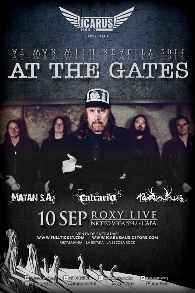 Argentina se regocijó con una nueva visita de la legendaria banda sueca At the Gates, pioneros del death melódico y principales responsables de la creación del sonido Gotemburgo, junto a bandas como Dark Tranquility e In Flames. Luego de editar su obra cumbre Slaughter of the soul en 1995, se separaron en el pico de su carrera. Más de una década después volvieron a los escenarios, y emprendieron una gira que los acercó por primera vez a nuestro país promediando el 2012. Luego de algunas especulaciones, negativas y rumores acerca de nuevo material, finalmente editaron a finales de 2014 su primer disco en casi 20 años, titulado At war with reality. Con la flamante placa bajo el brazo, bajaron nuevamente a Sudamérica para presentar las nuevas canciones y los inoxidables clásicos ante el siempre fiel y efusivo público argentino. La cita fue pactada para el día 10 de Septiembre, en el Roxy Live. Un lugar más íntimo y con mejor sonido que el Teatro de Flores, donde originalmente se iba a realizar el evento.